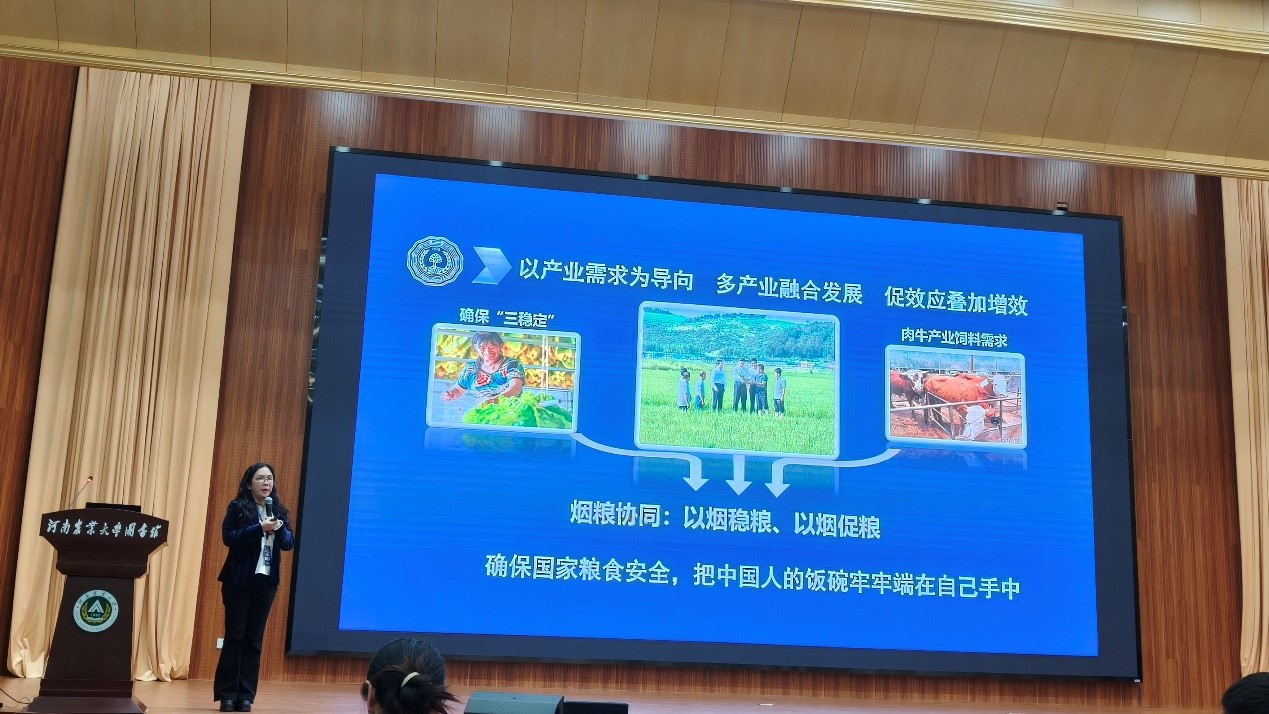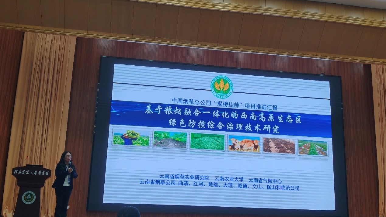 刘雅婷教授围绕西南高原生态区粮烟融合一体化绿色发展的关键领域,重点介绍了本项目构建了“烟+粮+油”周年轮作模式,系统开展了生态气候区划、绿色防控、种植模式优化等关键研究。项目明确了夏粮季油菜、蚕豆等作物的气候适宜区,完成精细到烟田的地块区划,为优化种植布局提供了科学依据。通过大田试验验证,烤烟套种玉米、大豆等模式在维持烤烟产量和产值的同时,有效改善了烟叶化学品质与感官评吸特性,提升了土壤养分均衡性。研究还系统揭示了烟后玉米病害发生规律及叶际微生物调控机制,明确了有机酸类代谢物在诱导抗病性方面的作用。项目构建了以“一覆两封”为核心的烟田杂草综合治理体系,集成推广了微生物菌剂、天敌昆虫等绿色防控手段,实现了从烟草到烟后作物的全周期绿色防控。2025年,项目在全省13个州市推广示范面积持续扩大,预计烟后作物增收经济效益超过1.1亿元,有效化解了“烟粮争地”矛盾,为实现“粮烟双赢”、保障区域粮食安全与农业可持续发展提供了可复制的云南方案。